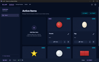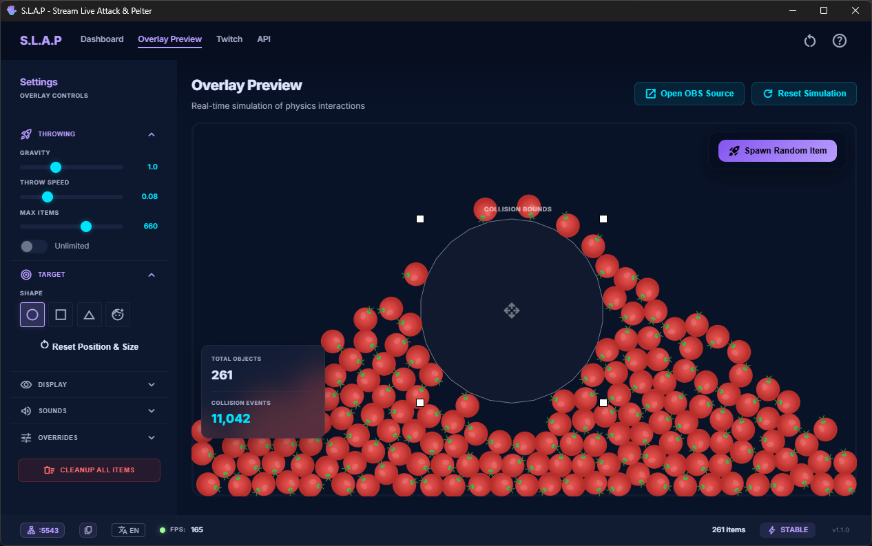 SLAP is a streamer tool that lets you (and your chat) hurl images at a target on your stream. Items have real physics, they bounce, pile up, explode, and generally make a mess. Add it as a browser source in OBS or Meld and let the chaos begin.