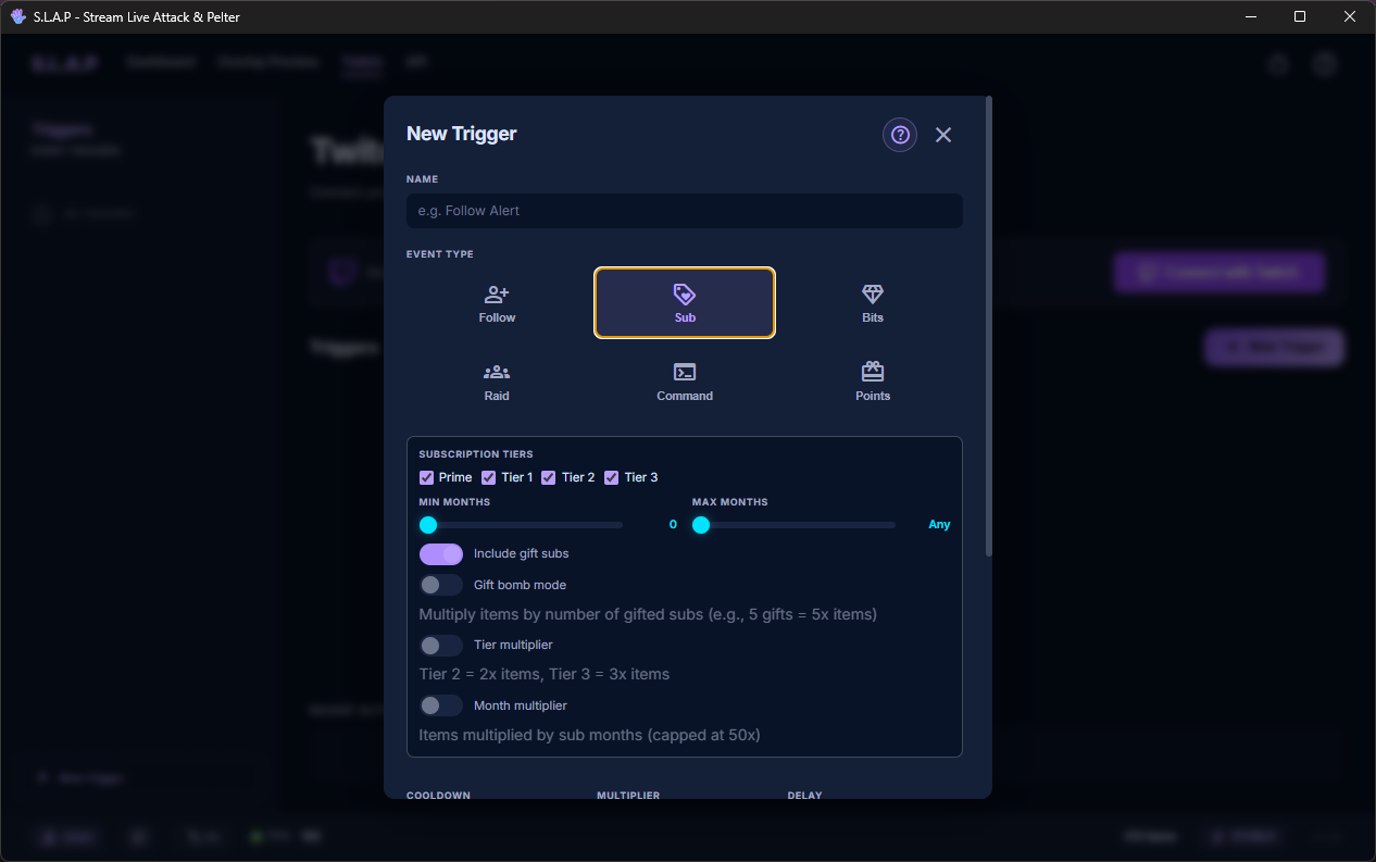 - Per-trigger cooldowns and role restrictions (everyone, subs, mods, VIPs)